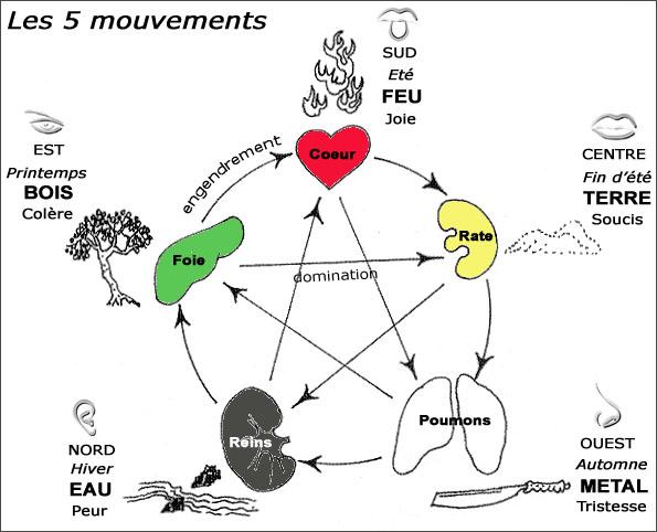 Le concept des cinq éléments fut rapidement intégré à la théorie du yin et du yang. Les cinq éléments sont associés aux saisons, couleurs, saveurs, sentiments, climats, organes. Le cycle d’engendrement montre le processus perpétuel du mouvement universel.